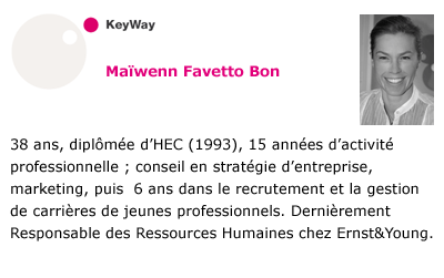 Qui sommes-nous ? Les fondatrices« Nous avons travaillé ensemble plusieurs années en entreprise, occupant des fonctions liées aux ressources humaines et au recrutement. Nous avons ainsi interviewé dans le cadre d'entretiens de recrutement et de carrière plusieurs centaines d'étudiants, jeunes diplômés et jeunes professionnels » « La plupart d'entre eux n'avaient, à aucun moment dans leur parcours de formation, pris le temps de la réflexion concernant les enjeux de leur future vie professionnelle, ni eu les moyens de bâtir un projet véritablement personnalisé » « Face à ce constat s'est imposée l'envie de mettre notre expérience et nos compétences à leur disposition pour leur donner les moyens de choisir plutôt que de subir leur avenir professionnel, en nous inspirant de méthodologies professionnelles qui ont fait leurs preuves » « Nos parcours respectifs nous ont amenées à développer des réseaux solides et étendus sur lesquels nous nous appuyons pour rester en prise permanente avec l'offre disponible de formations, la réalité des secteurs d'activités et des fonctions dans l'entreprise » > Maïwenn Favetto Bon > Anne-Sylvie RaimbaultKeyWay : la clé, le chemin Se prononce : [kaoué] [Kèouê] [kiouaille]